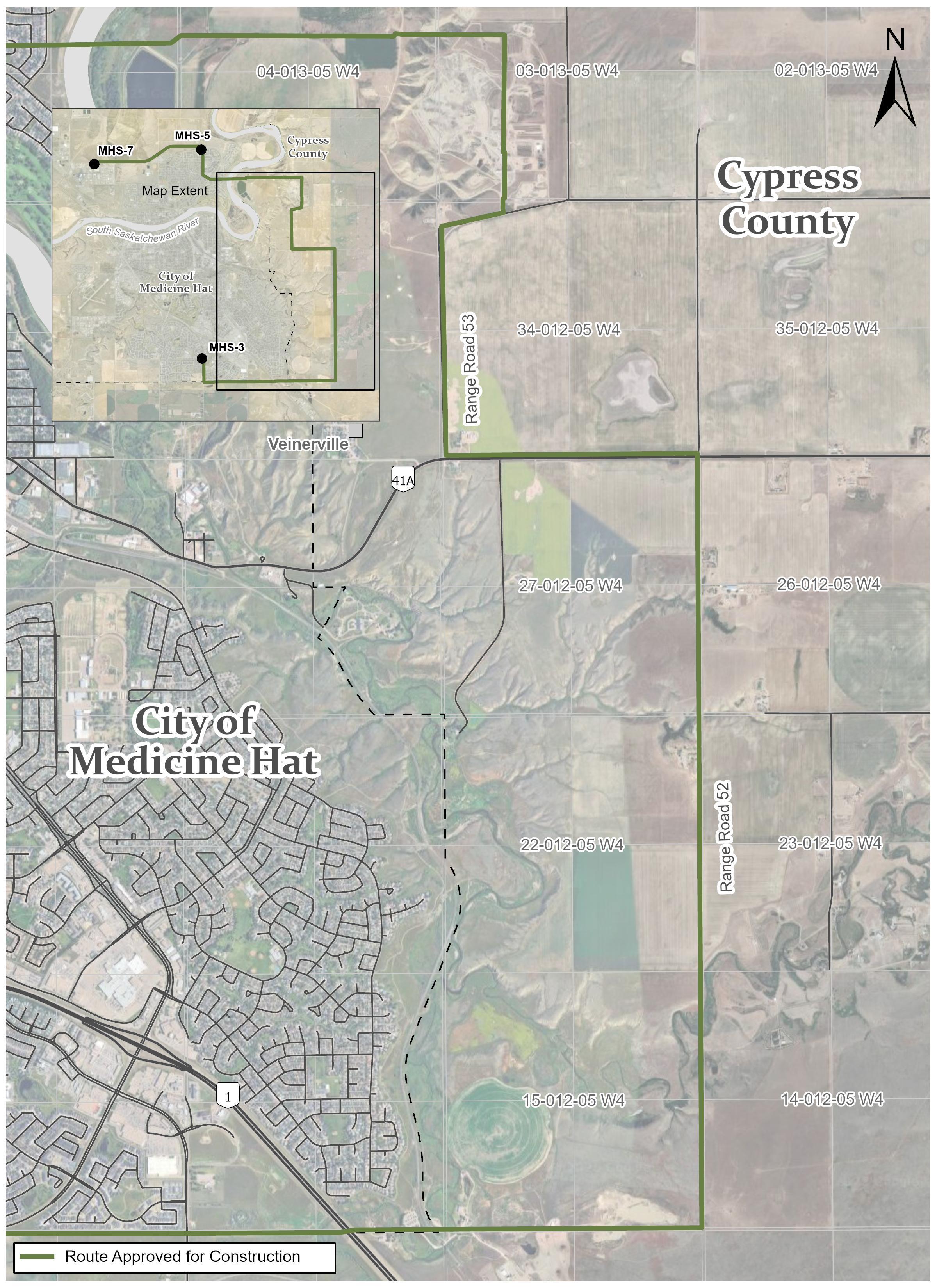 The preferred transmission line scenario presented as part of Proceeding #29538 was approved by the Alberta Utilities Commission on August 28, 2025. The transmission line follows along Range Road 52 and 53.