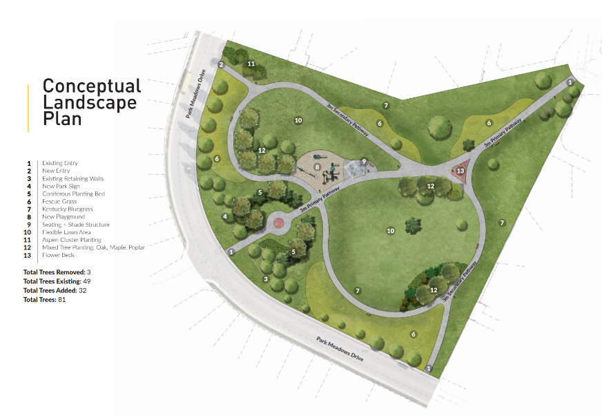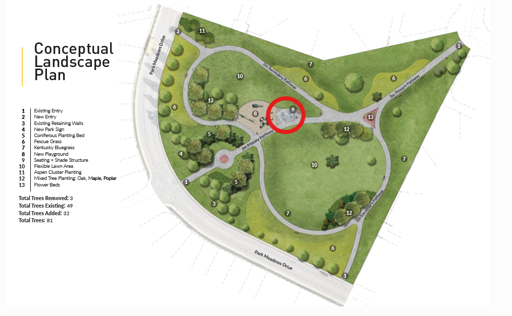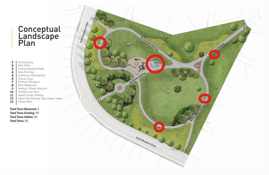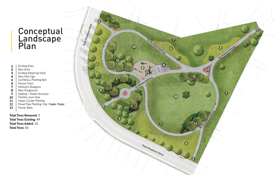 On April 16, 2025, we hosted an open house at Park Meadows Estates where we shared the first conceptual drawing for the park upgrade at S.F. Scott Memorial Park. The feedback we received from the open house and the survey can be read in this What We Heard report. Based on April's neighbourhood feedback, we made significant changes to the park design, which is now at a final stage (with minor tweaks to the design only).
