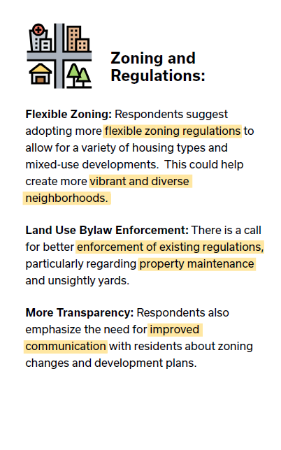 The proposed draft Land Use Bylaw is available online and Planning and Development Services (PDS) is welcoming written feedback throughout the process. In addition, you can view the proposed zoning by consulting the map here. "Zoning" is a municipal regulation that divides a community into different districts, such as residential, commercial, or industrial, and sets specific rules for how land and buildings can be used within each district. You can learn more about zoning, and consult the current zoning map on our website here.